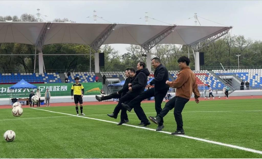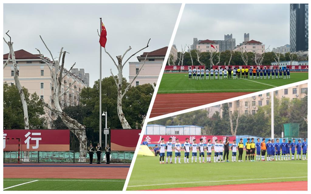 10点一刻,庄严的国歌声中,五星红旗在赛场缓缓升起。随后运动员代表和裁判员代表依次上台庄严宣誓,双方运动员在公平竞赛旗的引领下列队上场,体育学院院长孙竞波、副院长刘少园,经济学院党委副书记崔金涛,环境科学与工程学院学工组组长周博坤共同为揭幕战开球。